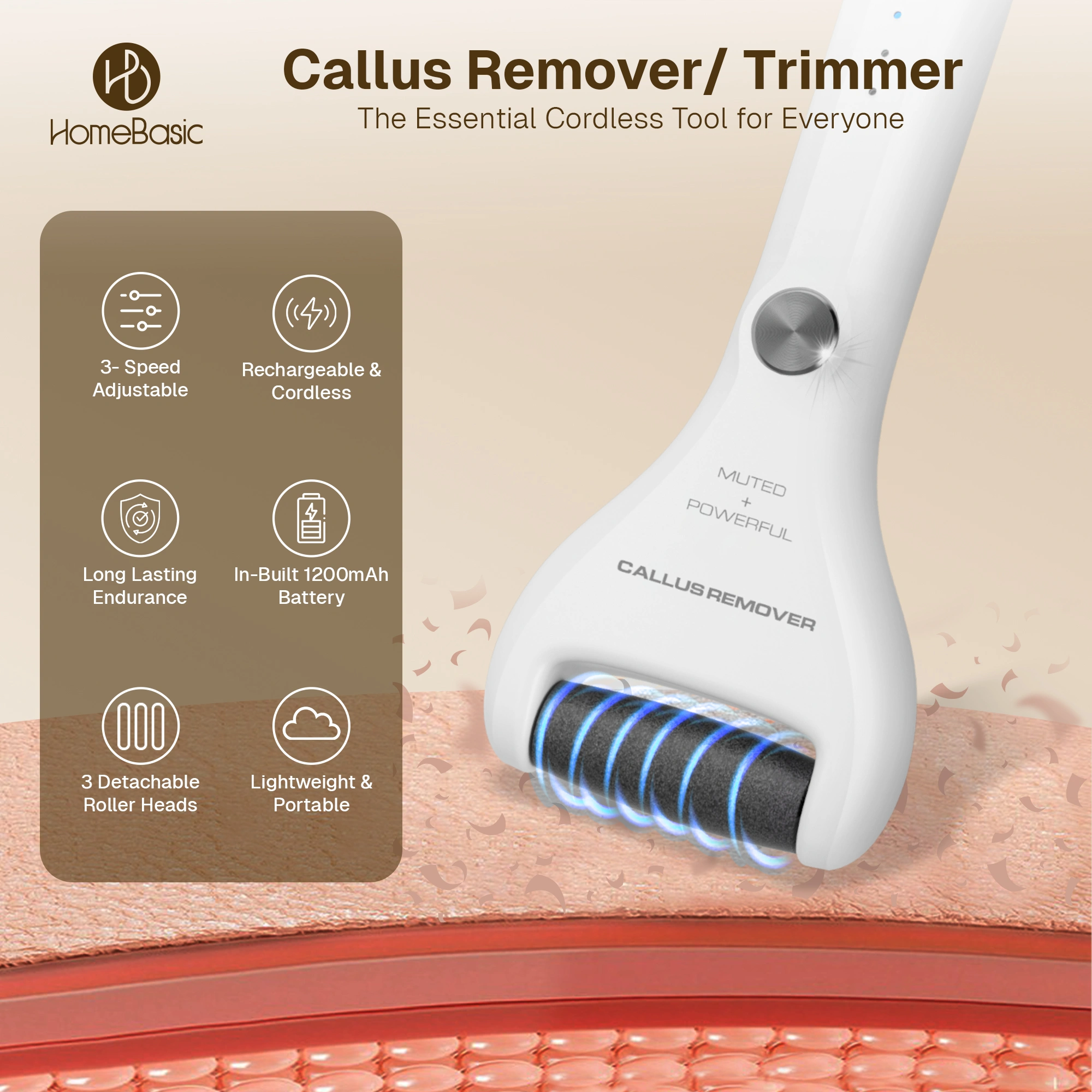 – Painless operation—removes tough, dry skin gently and safely