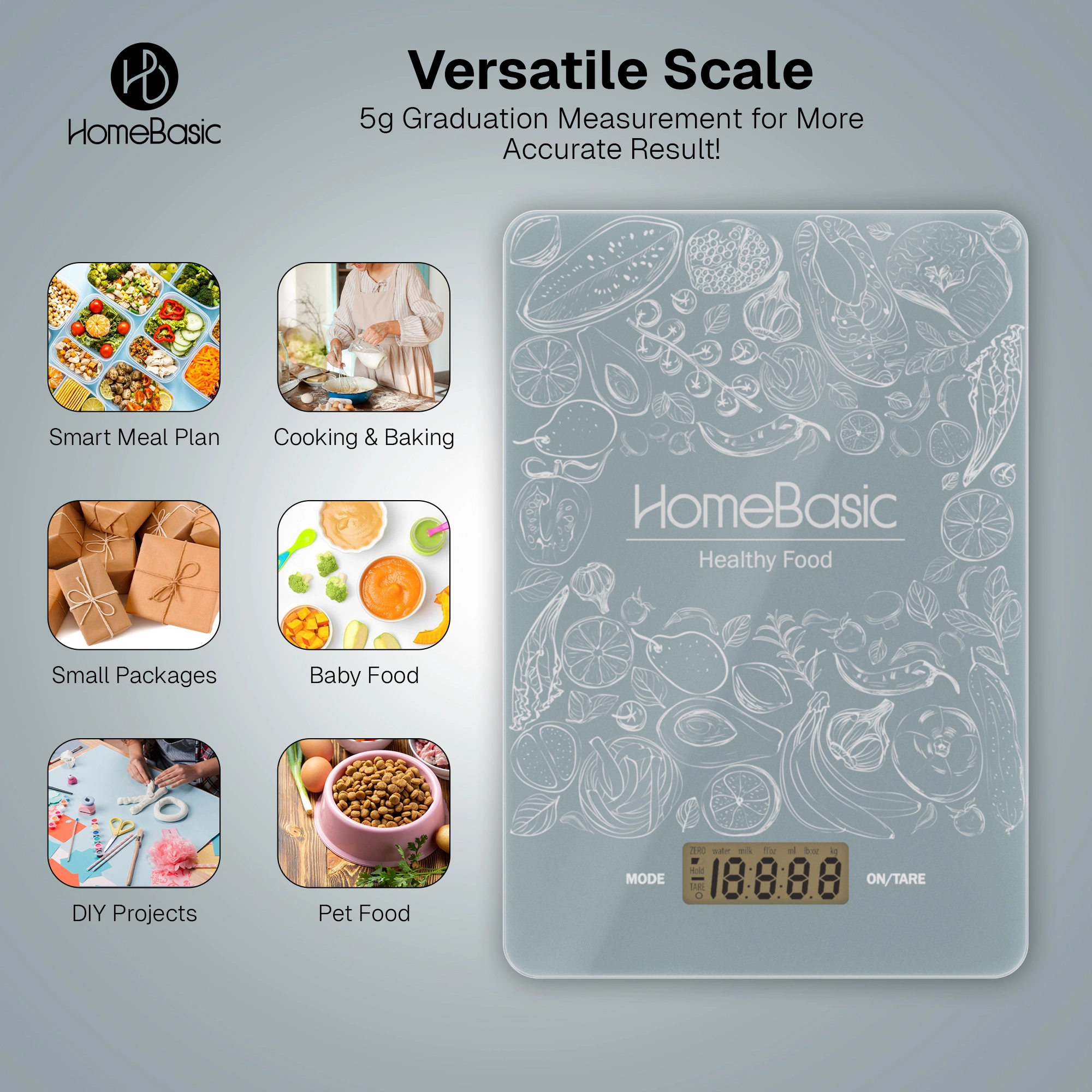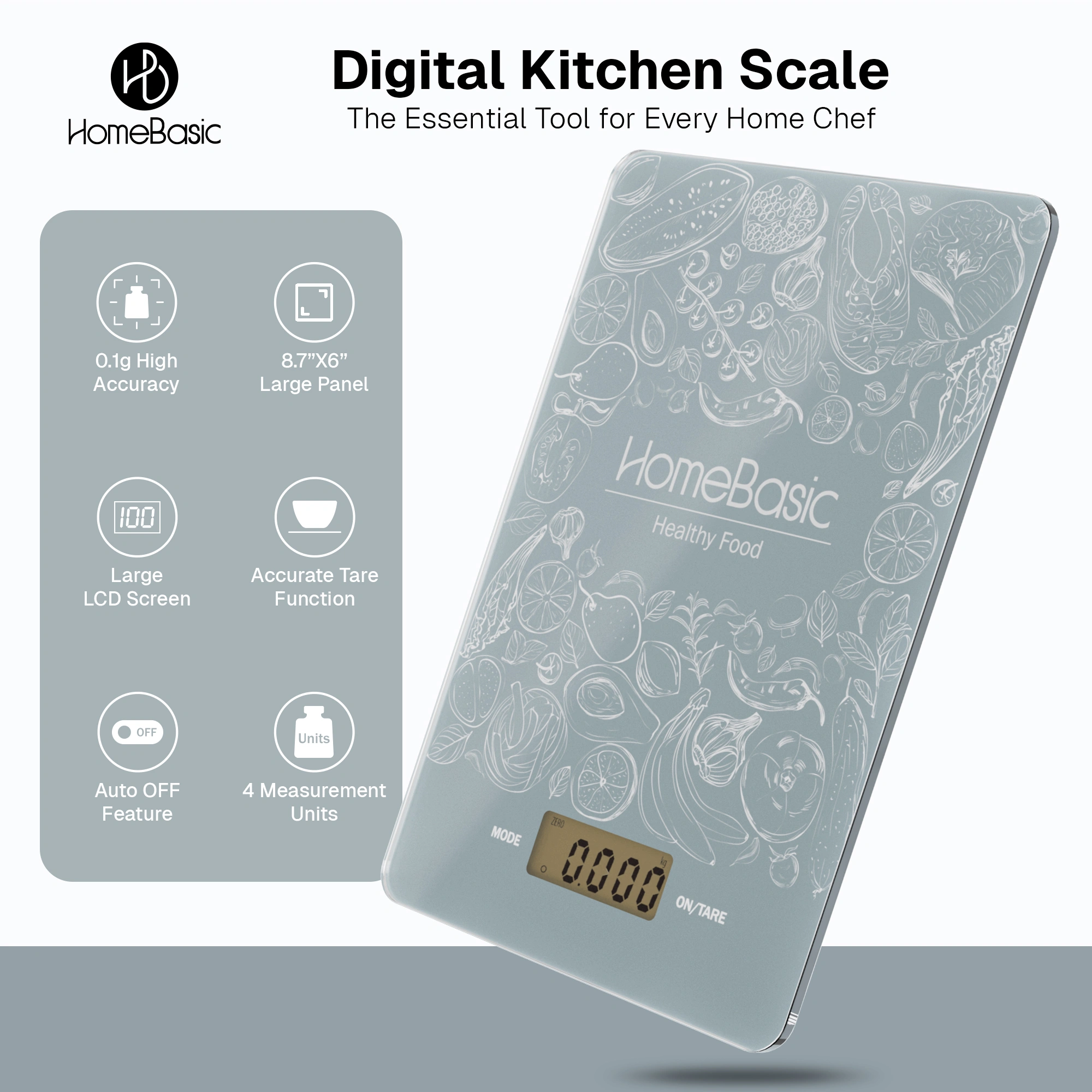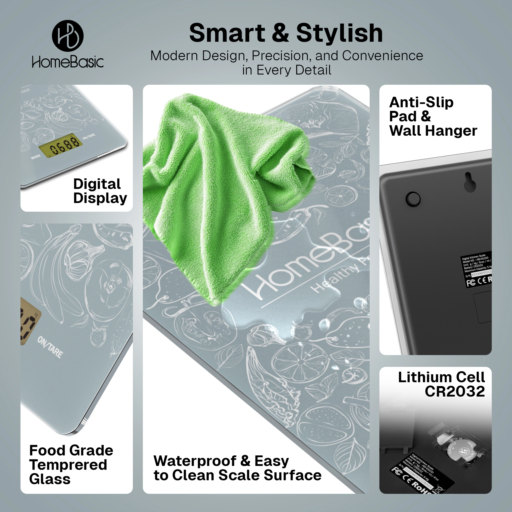 Crafted with a sleek, hygienic, and easy-to-clean food-grade glass surface, the spacious 8.7 x 6-inch platform accommodates bowls and plates with ease. This kitchen weighing machine features advanced sensors, intuitive touch buttons, and a LCD screen for a seamless user experience.