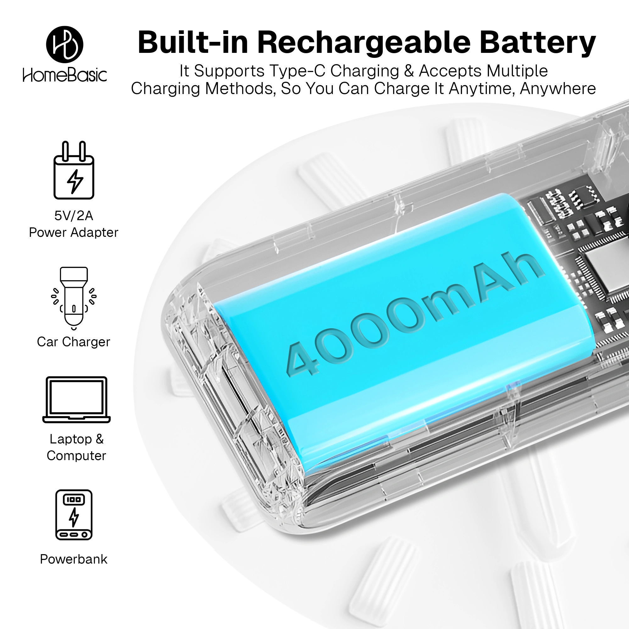 • Long-Lasting Battery: 4000mAh USB rechargeable battery provides up to 12 hours of use.
