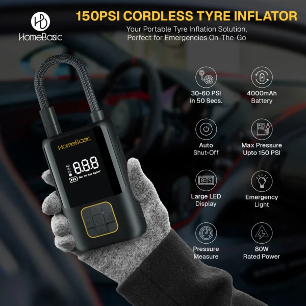 The HOMEBASIC Air Master Portable Air Pump is designed for convenience, reliability, and power. Whether you’re on a road trip, cycling adventure, or facing an unexpected tire deflation, this compact and cordless air pump is your go-to solution. Its lightweight design makes it easy to carry, ensuring you’re always prepared.